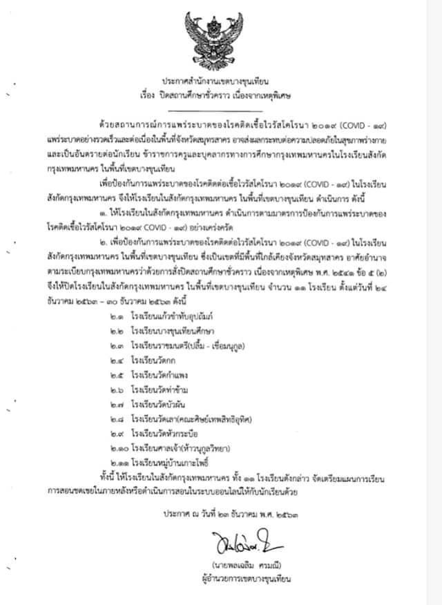 ประกาศ ปิดสถานศึกษาชั่วคราวด้วยเหตุพิเศษ