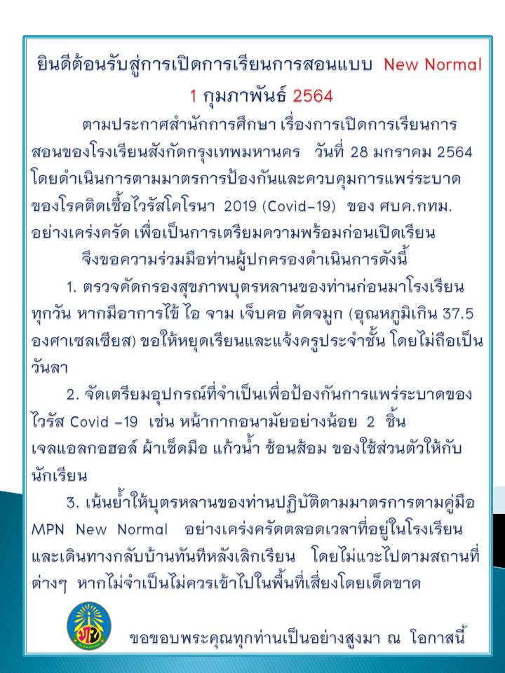 ข้อปฏิบัติวันเปิดการเรียนการสอน 1 กุมภาพันธ์ 2564